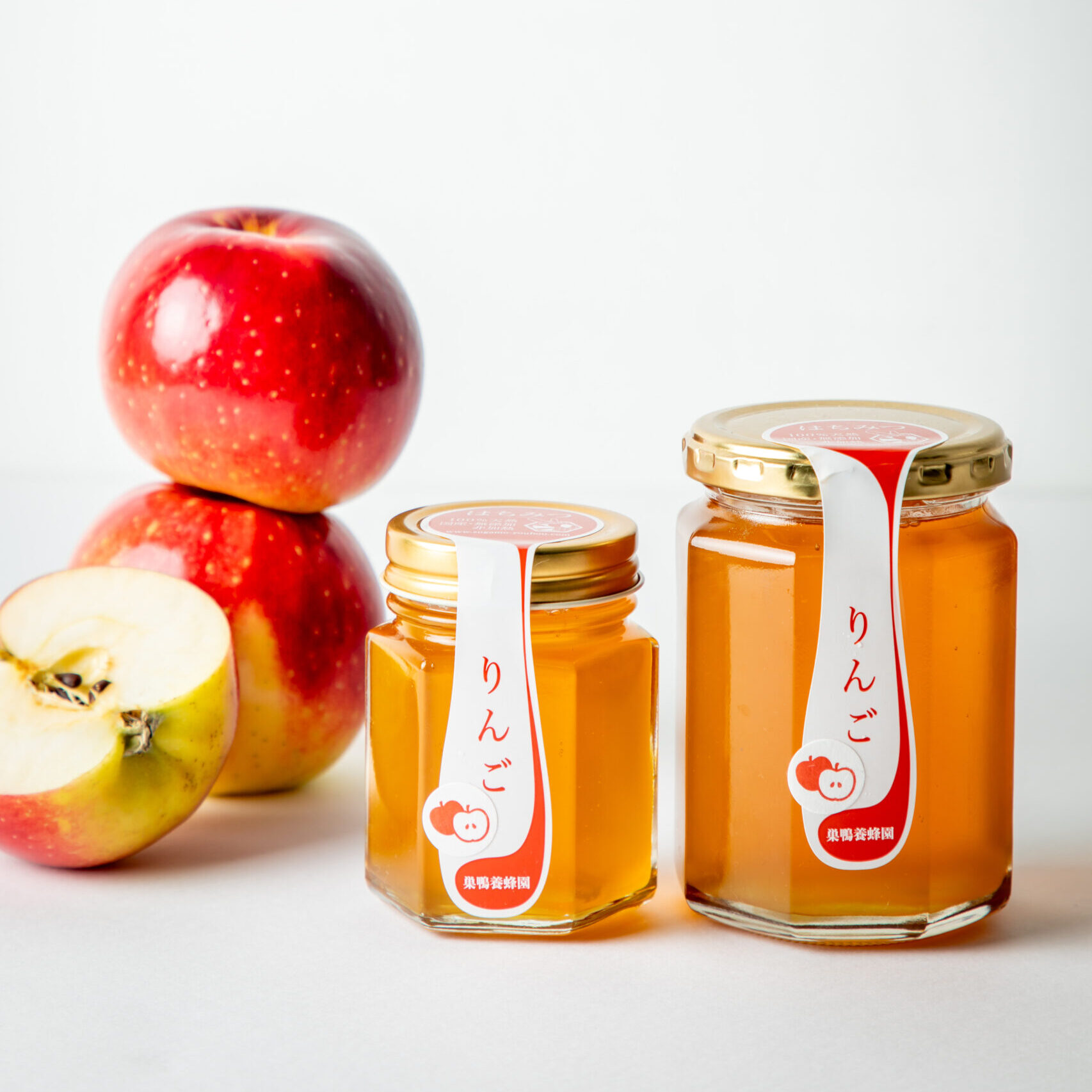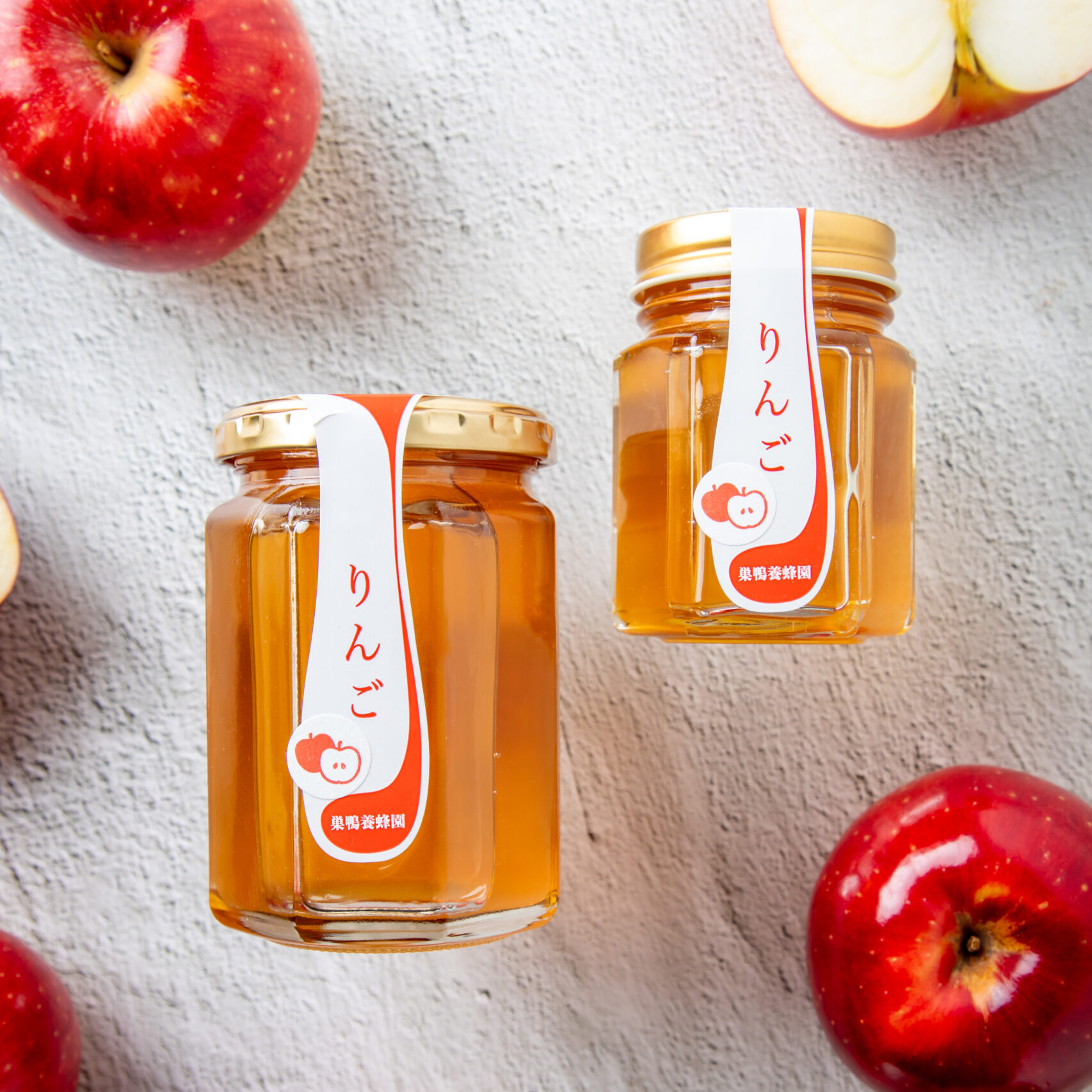 りんごのはちみつ採れました。可愛らしいりんごのイラストが入ったラベルが目印。